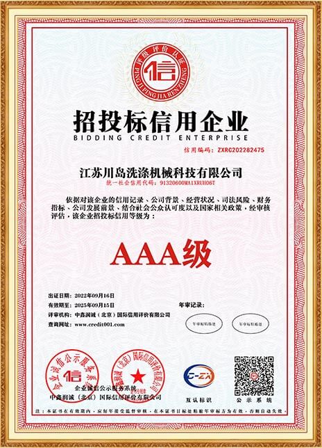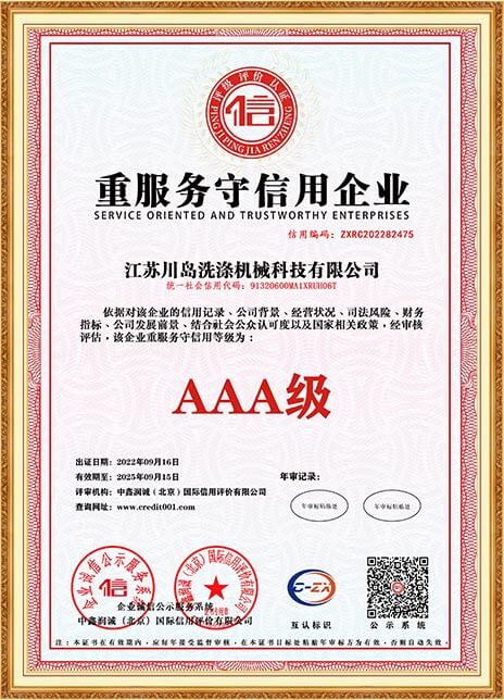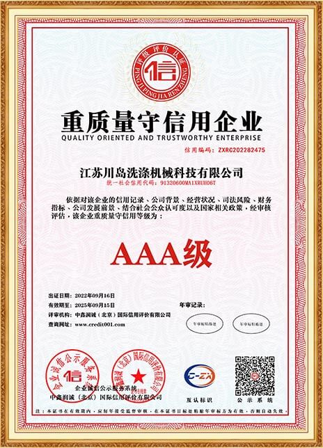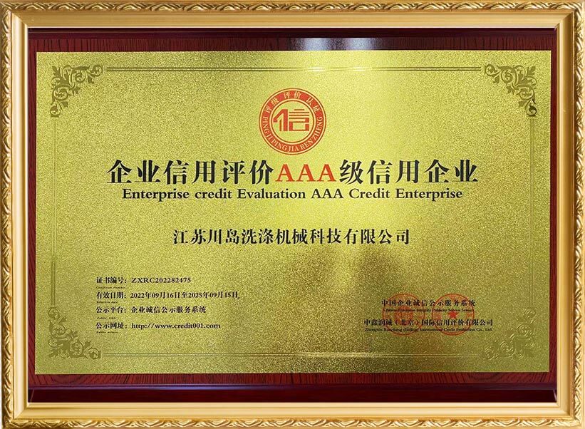川島近年來獲得多項(xiàng)權(quán)威標(biāo)準(zhǔn)和認(rèn)證,諸如中國(guó)洗滌機(jī)械行業(yè)十強(qiáng)企業(yè),中國(guó)輕工業(yè)裝備制造行業(yè)五十強(qiáng)企業(yè),AAA級(jí)信用企業(yè),韓國(guó)KC、歐盟KC證書,多項(xiàng)國(guó)家專利等。